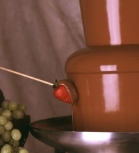Beeld een fontein in vervang het water door warme Belgische chocolade, en zie vloeiende chocolade waarin u en uw gasten vers fruit, lange vingers, soesjes, marshmallows e.d.